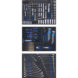 Composé de servante d'atelier art. 4108 avec 4 inserts de servante d'atelier 3/3 en mousse dure robuste de bonne qualité (dimensions 567 x 408 x 32 mm) Épaisseur de paroi du corps: 1,6 mm Épaisseur de paroi des tiroirs: 1,3 mm Roulettes robustes de 125 mm sur roulement à billes, dont 2 roulettes pivotantes verrouillables À verrouiller au moyen d’une...